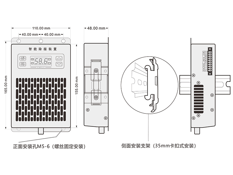 1、使用M5螺釘或者5mm的鉚釘固定。安裝時(shí)除濕裝置必須豎放,出水口朝下。